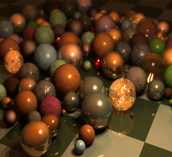 A few years ago, I got interested in the freeware renderer, POV-Ray. This image was a test of various materials you could use to render shapes with.