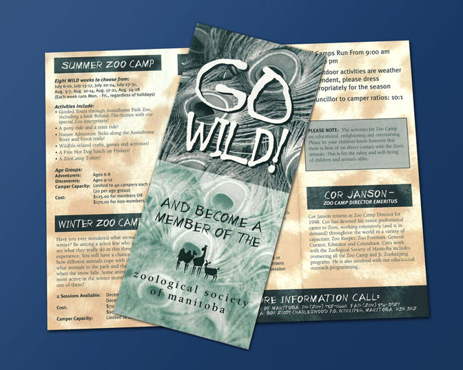 Some fun brochures outlining programs at the Winnipeg Zoo. They had to be on the cheap, so Spot Colours were used and animal print backgrounds were used.