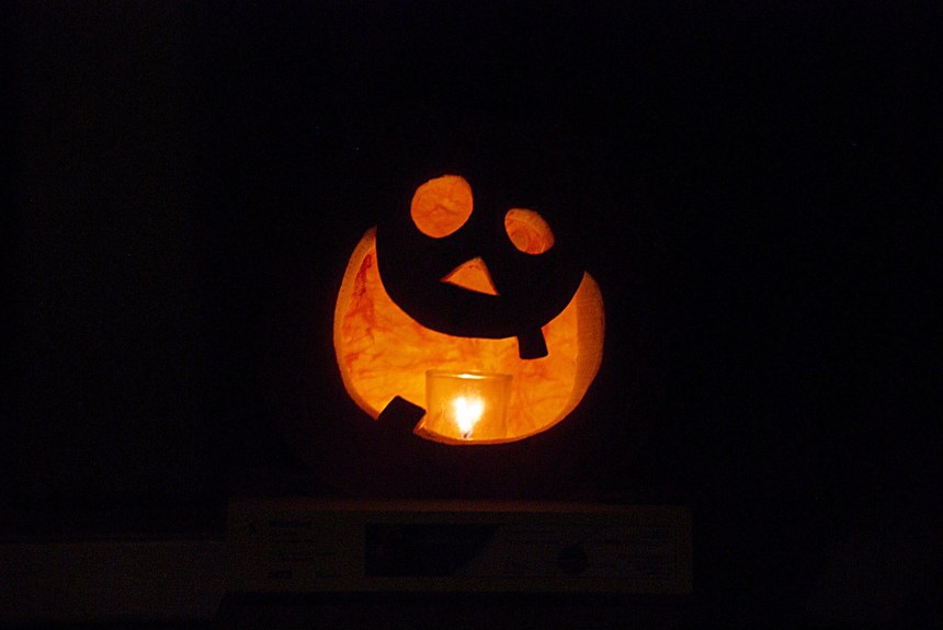 So every year I put my fear of slicing myself to pieces and my sometimes acute sympathy pains aside and lobotomize a pumpkin. Not sure why, as we only had six kids this year. An all time low. We usually hit the double digits. Guess that’s what you get when you live on a sometimes busy street and almost none of the neighbours do anything for the trick or treaters. Also means we have quite a bit of candy to get through. Darn it all to heck.