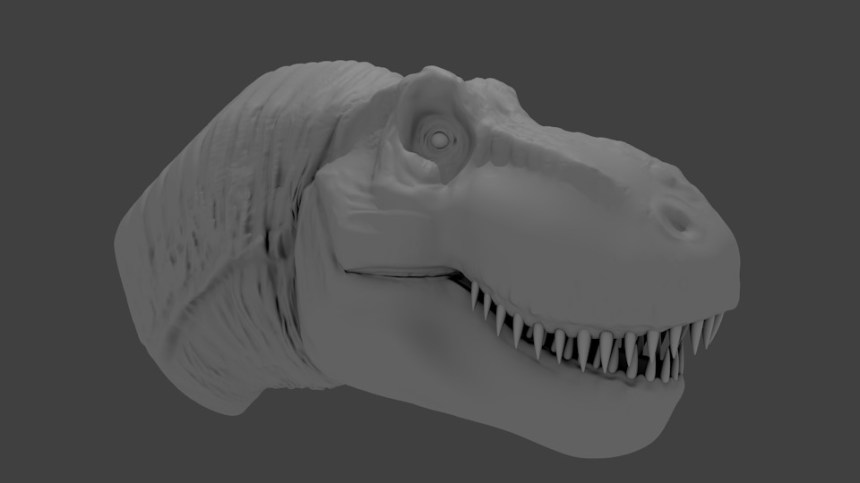 In celebration of my first trip to the Manitoba Museum in a while, I decided to see just how detailed a 3D model I could make of a dinosaur head. This one is more or less based on T-rex. I still have a wee bit more detail that I’d like to add to the model. Mostly around the mouth area. Then all I have to do is texture, light and render out a final image.