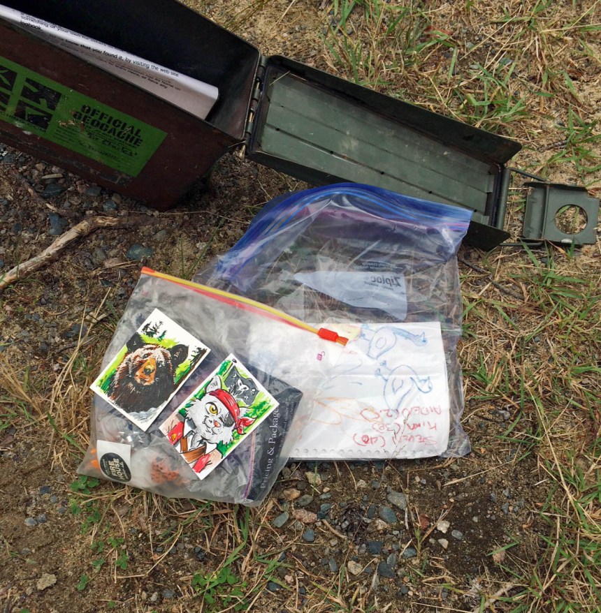 Last year, I was out of town. But I wanted to participate in World Art Drop Day, so I put together several sketch cards to drop in our geocache.