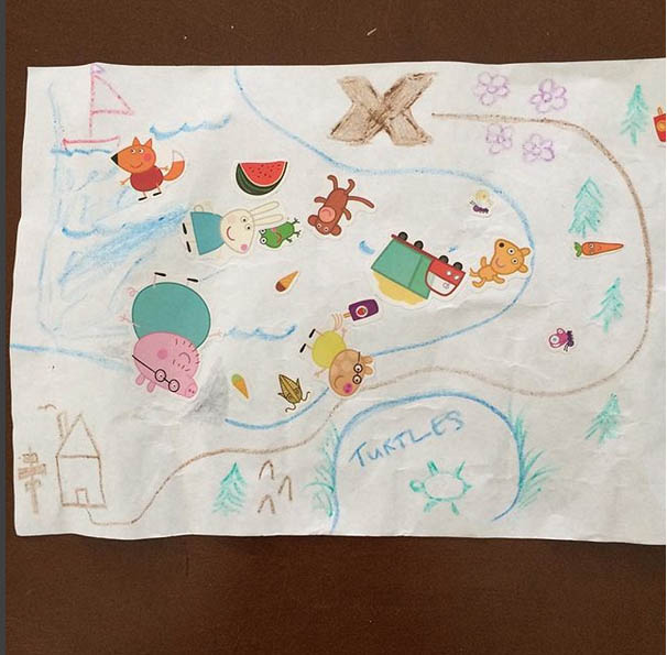 A pretty accurate map of where to find our geocache. Courtesy of my 4 year old son. I think his mother helped with some of the words.