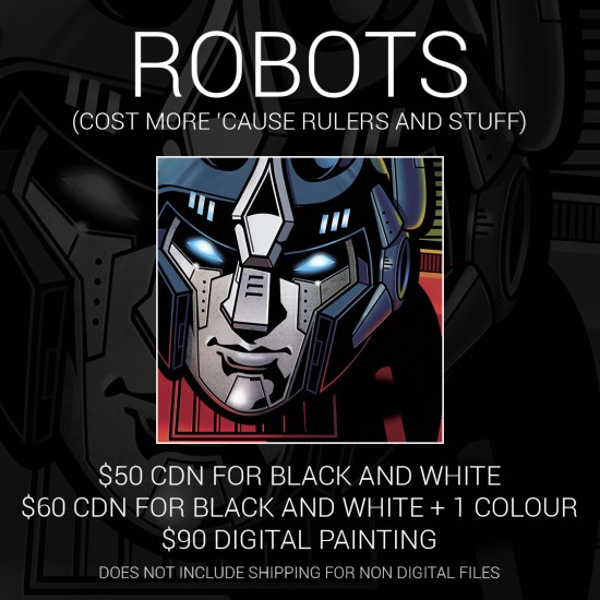 I’ve attached some examples of what I’m after for now. They fall under 4 main categories: Social Media Avatars, Black and White Sketches, Black and White with one Extra Colour, Digital Painting, and Robots. I have Robots as separate category, as they can get extra finicky and I think that deserves a special price point. All hand drawn pieces will be 8 x 10. Social Media Avatars should have a pretty tight turnaround and will be done fairly loosely – they are generally only seen small and will not have a lot of detail in them. Digital Paintings will take the longest. Notice all the example are waist up or portraits? That’s all I am doing for now.