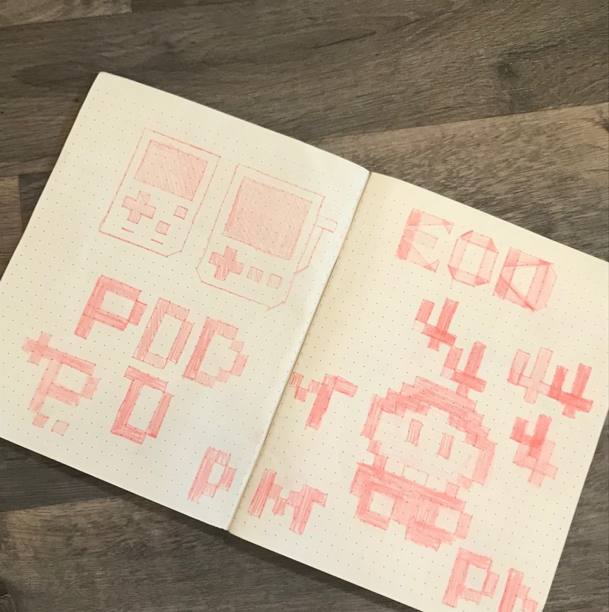 I picked up a grid notebook from Walmart of all places (the price was right and it had a grid and was pretty huge) and I went to town. Just playing around with some icons, pictograms and lettering. Even some 8-bit art. Anything that really lent itself to a very strict grid structure.